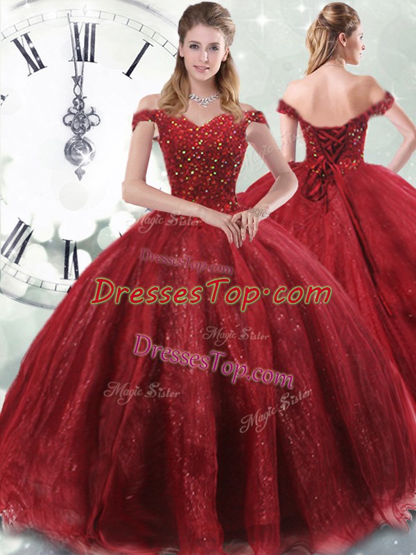 Stylish Wine Red Off The Shoulder Lace Up Beading 15th Birthday Dress Brush Train Sleeveless