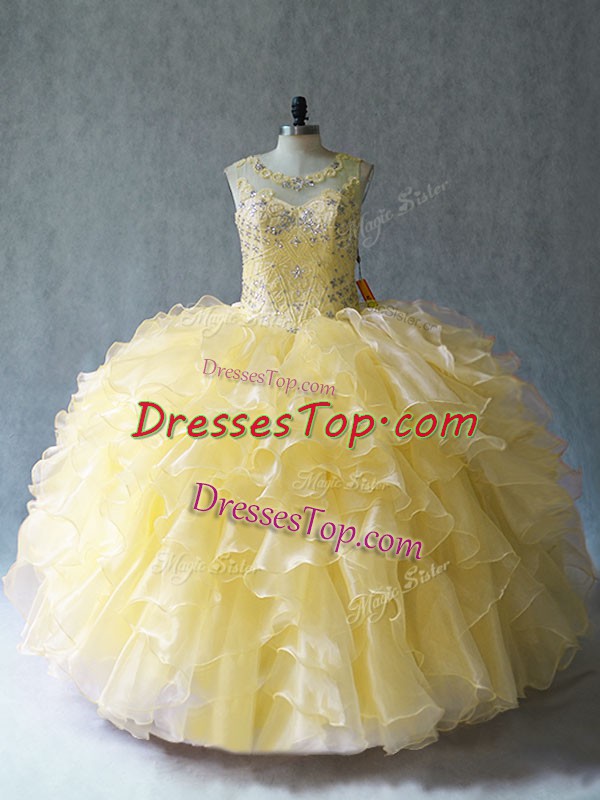 Stylish Yellow Sleeveless Beading and Ruffles Floor Length Quince Ball Gowns