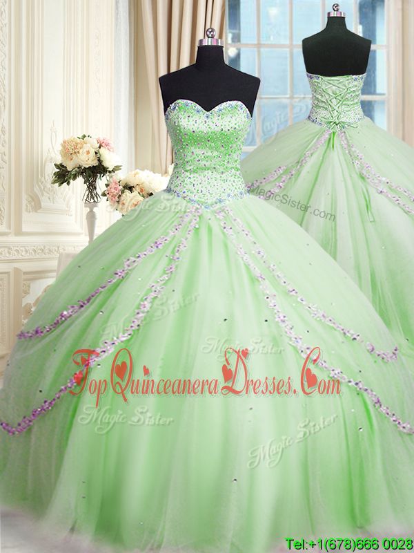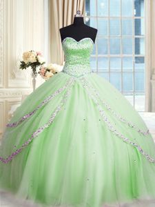 Suitable Apple Green Lace Up Ball Gown Prom Dress Beading and Appliques Sleeveless With Train Court Train