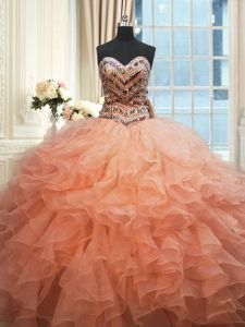 Suitable Beaded Bodice Sweetheart Sleeveless Quinceanera Gown Floor Length Beading and Ruffles Peach Organza