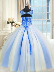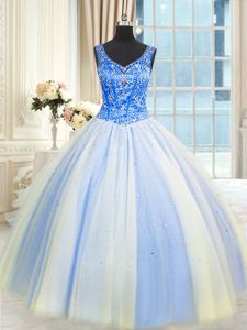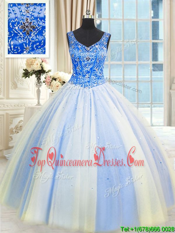 Suitable Beading and Sequins Quince Ball Gowns Blue And White Lace Up Sleeveless Floor Length