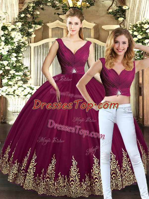 Suitable Burgundy 15th Birthday Dress Military Ball and Sweet 16 and Quinceanera with Beading and Appliques V-neck Sleeveless Backless
