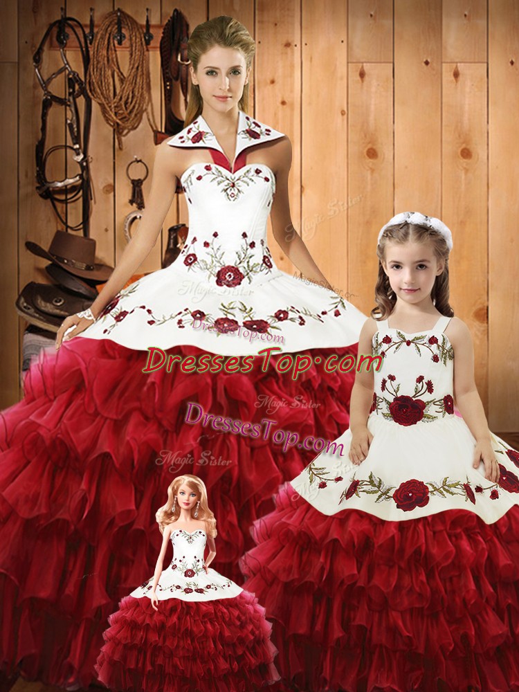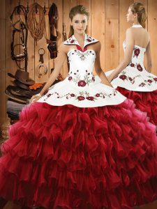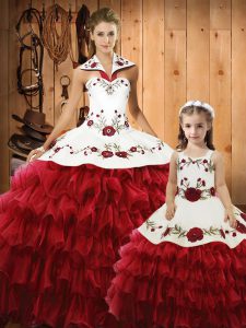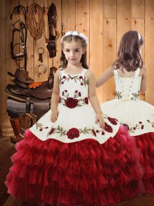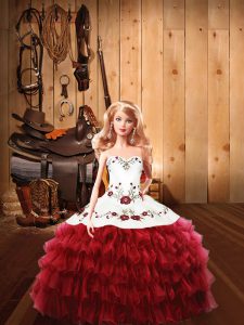 Suitable Embroidery and Ruffles Ball Gown Prom Dress Wine Red Lace Up Sleeveless Floor Length