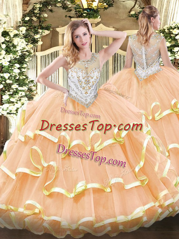 Suitable Floor Length Ball Gowns Sleeveless Peach Quinceanera Dresses Zipper