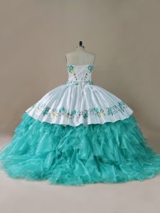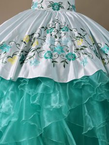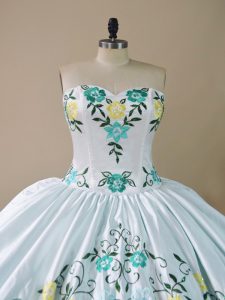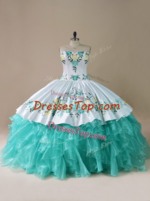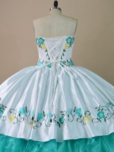 Suitable Floor Length Lace Up 15th Birthday Dress Blue And White for Sweet 16 and Quinceanera with Embroidery and Ruffles