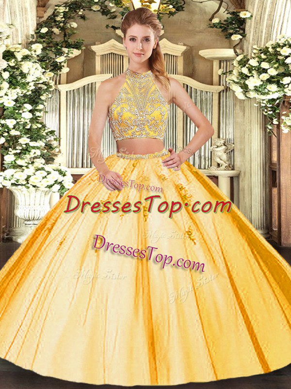 Suitable Gold Halter Top Neckline Beading and Appliques Sweet 16 Quinceanera Dress Sleeveless Criss Cross