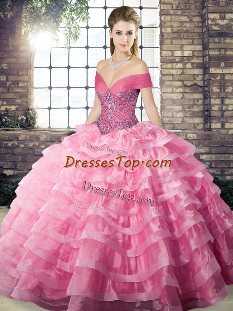 Suitable Lace Up 15 Quinceanera Dress Rose Pink for Military Ball and Sweet 16 and Quinceanera with Beading and Ruffled Layers Brush Train
