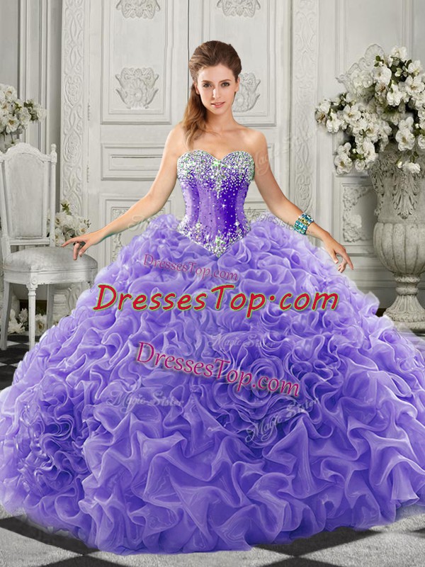 Suitable Lavender Lace Up 15th Birthday Dress Beading and Ruffles Sleeveless Court Train