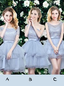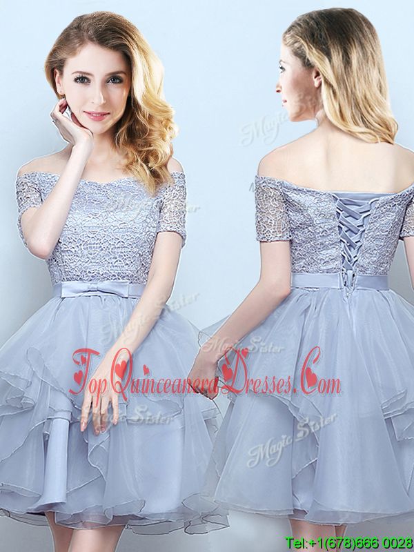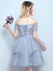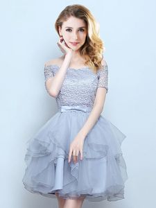 Suitable Off the Shoulder Grey Organza Lace Up Court Dresses for Sweet 16 Short Sleeves Mini Length Lace and Ruffles and Belt