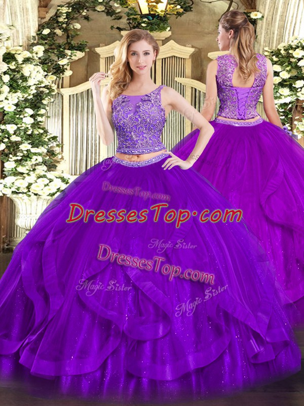 Suitable Organza Scoop Sleeveless Lace Up Beading and Ruffles Sweet 16 Dress in Purple