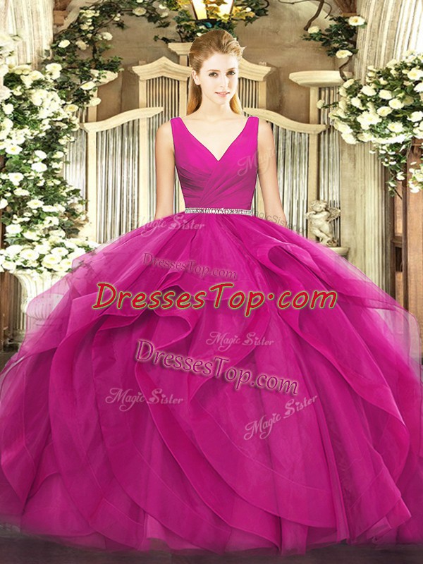 Suitable Sleeveless Floor Length Beading and Ruffles Zipper 15 Quinceanera Dress with Fuchsia