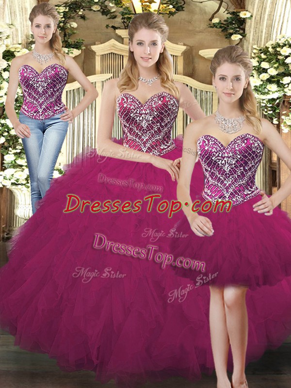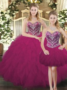 Suitable Sleeveless Organza Floor Length Lace Up 15th Birthday Dress in Fuchsia with Beading and Ruffles