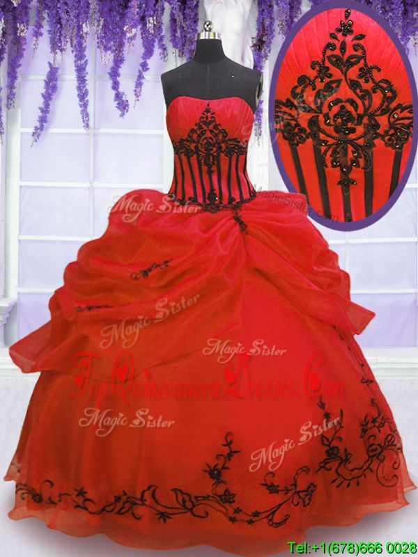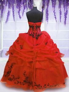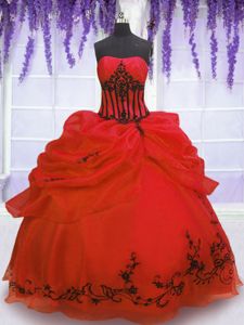 Suitable Sleeveless Organza Floor Length Lace Up 15th Birthday Dress in Red for with Embroidery and Pick Ups