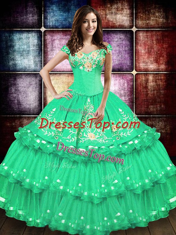 Suitable Turquoise Taffeta Lace Up Off The Shoulder Sleeveless Floor Length Vestidos de Quinceanera Embroidery and Ruffled Layers