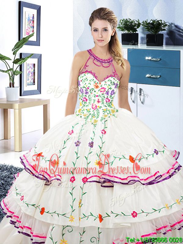 Suitable White Organza and Taffeta Lace Up Halter Top Sleeveless Floor Length Sweet 16 Quinceanera Dress Embroidery and Ruffled Layers