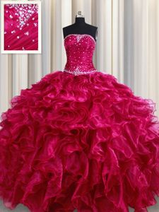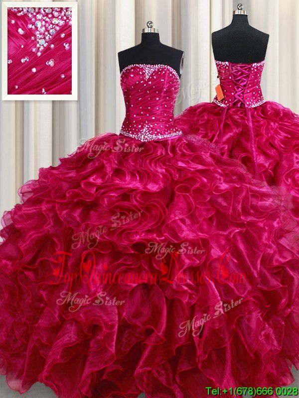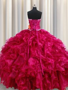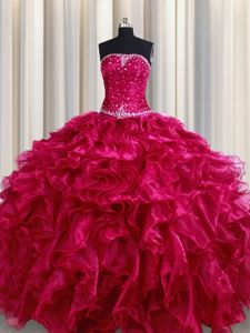Sumptuous Fuchsia Quince Ball Gowns Military Ball and Sweet 16 and Quinceanera and For with Beading and Ruffles Strapless Sleeveless Lace Up