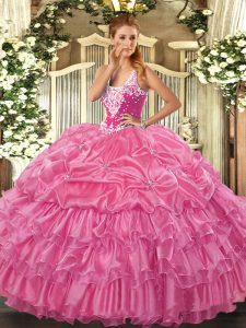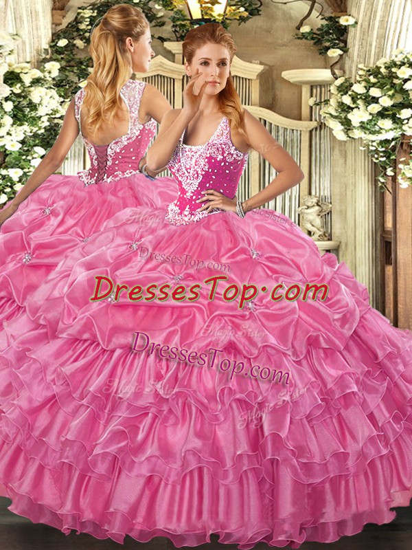 Sumptuous Rose Pink Straps Lace Up Beading and Ruffled Layers and Pick Ups Sweet 16 Dresses Sleeveless
