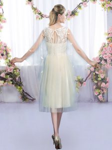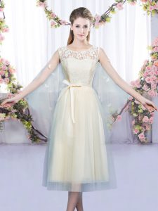 Sumptuous Tea Length Champagne Court Dresses for Sweet 16 Scoop Sleeveless Lace Up