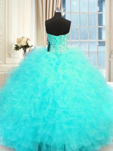 Sumptuous Three Piece Aqua Blue Ball Gowns Beading and Ruffles Sweet 16 Dresses Lace Up Tulle Sleeveless Floor Length