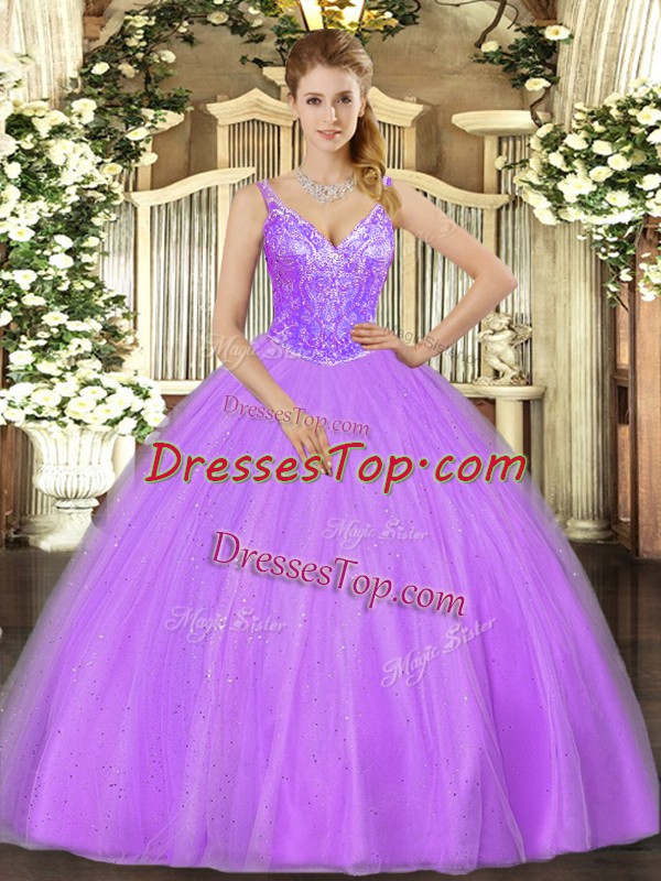 Sumptuous V-neck Sleeveless Lace Up Quinceanera Gowns Lavender Tulle
