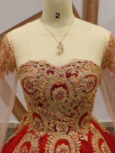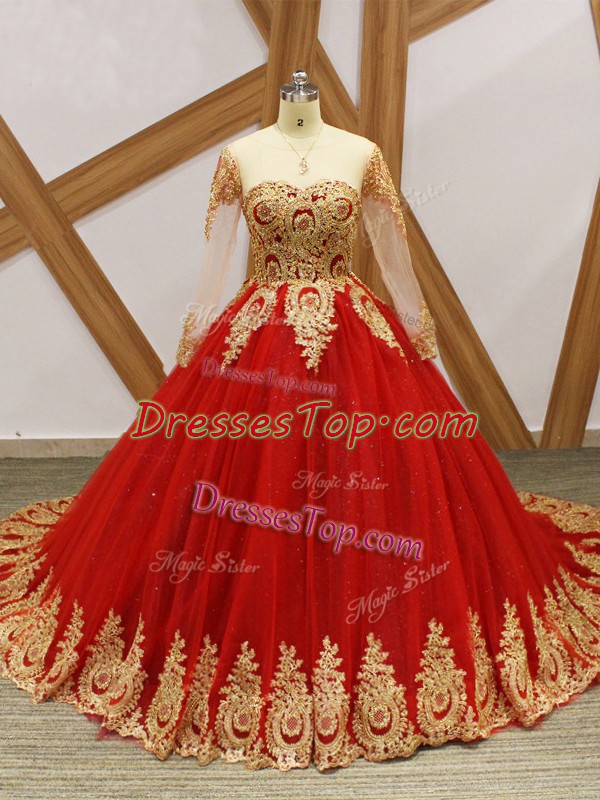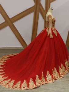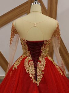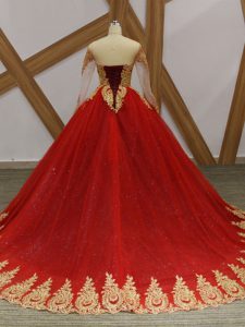 Sumptuous Wine Red Lace Up Quinceanera Gowns Beading and Appliques Long Sleeves Court Train