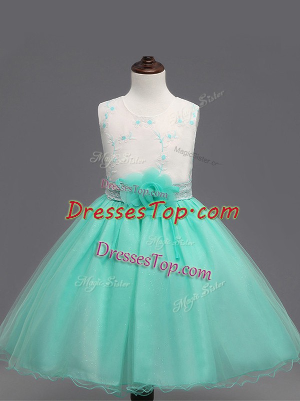 Super Apple Green Sleeveless Knee Length Appliques and Hand Made Flower Zipper Pageant Dresses