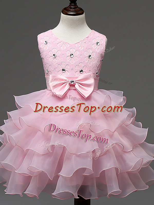 Super Baby Pink Organza Zipper Kids Formal Wear Sleeveless Knee Length Lace and Ruffled Layers and Bowknot