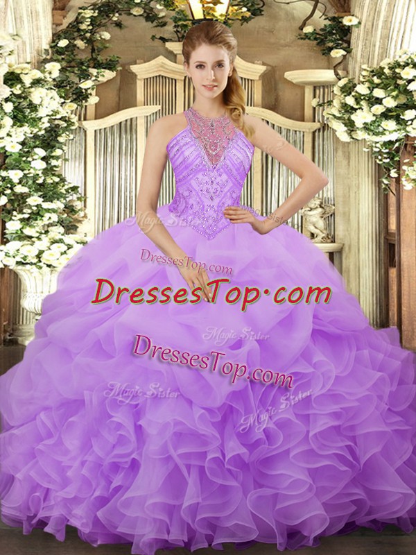 Super Ball Gowns Ball Gown Prom Dress Lavender Halter Top Organza Sleeveless Floor Length Lace Up