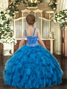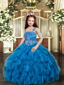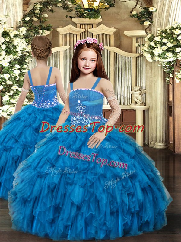 Super Ball Gowns Kids Pageant Dress Blue Straps Tulle Sleeveless Floor Length Lace Up