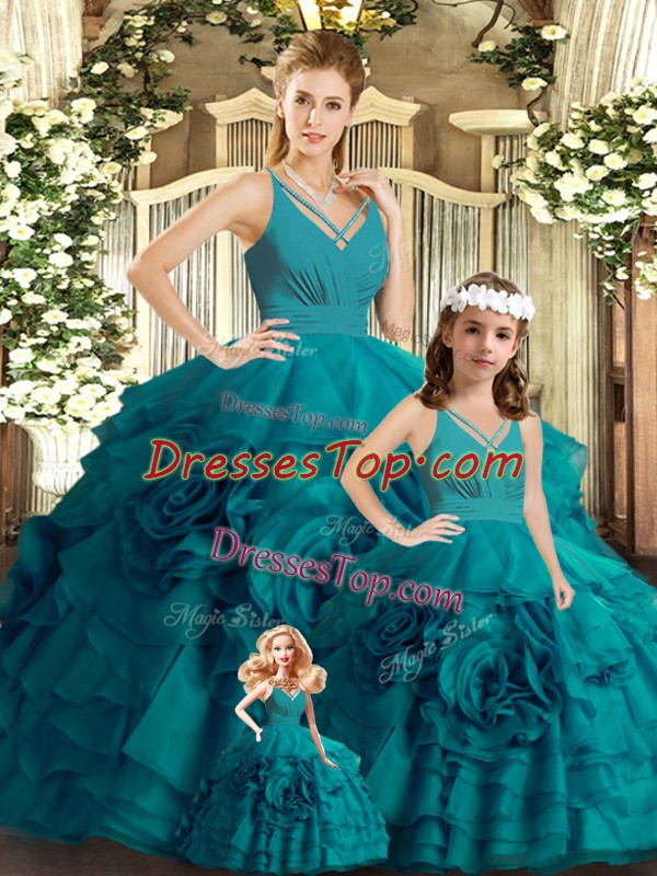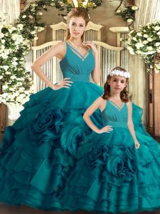 Super Ball Gowns Sleeveless Teal Quinceanera Dress Brush Train Backless