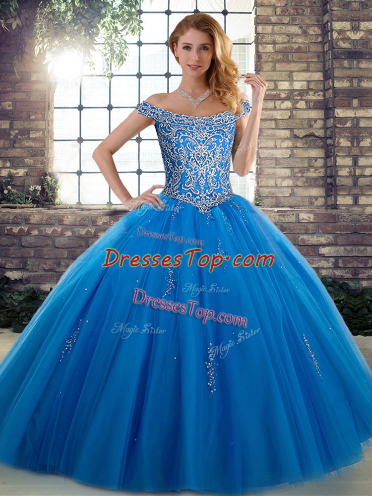 Super Blue Lace Up Quinceanera Gown Beading Sleeveless Floor Length