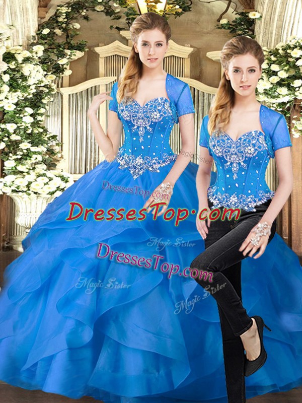 Super Blue Sweetheart Lace Up Beading and Ruffles Quinceanera Gown Sleeveless
