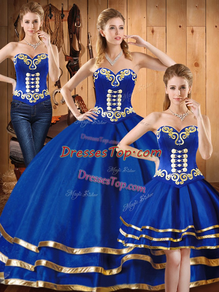 Super Blue Three Pieces Embroidery Quinceanera Gowns Lace Up Satin and Tulle Sleeveless Floor Length
