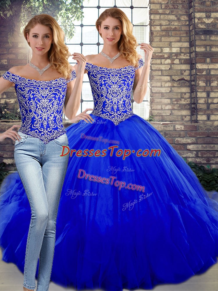 Super Floor Length Royal Blue Ball Gown Prom Dress Off The Shoulder Sleeveless Lace Up