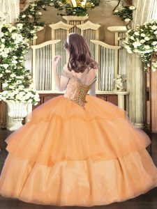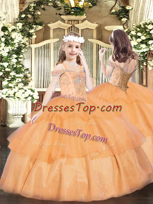 Super Orange Off The Shoulder Neckline Beading and Ruffled Layers Pageant Dress Sleeveless Lace Up
