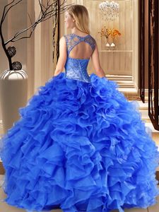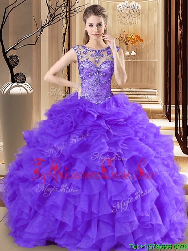 Super Purple Ball Gowns Scoop Sleeveless Organza Floor Length Lace Up Beading and Ruffles Sweet 16 Dress