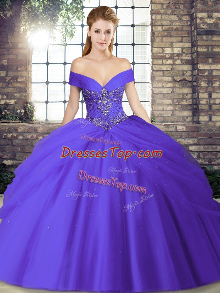 Super Purple Sleeveless Brush Train Beading and Pick Ups Quinceanera Dress