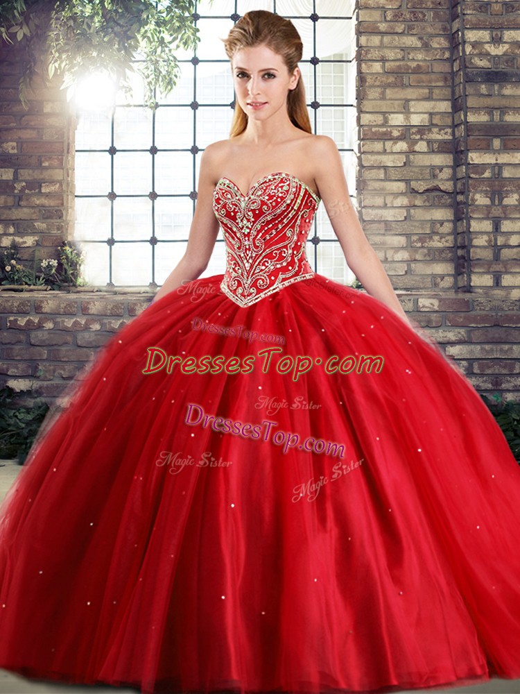 Super Sleeveless Beading Lace Up Sweet 16 Dresses with Red Brush Train