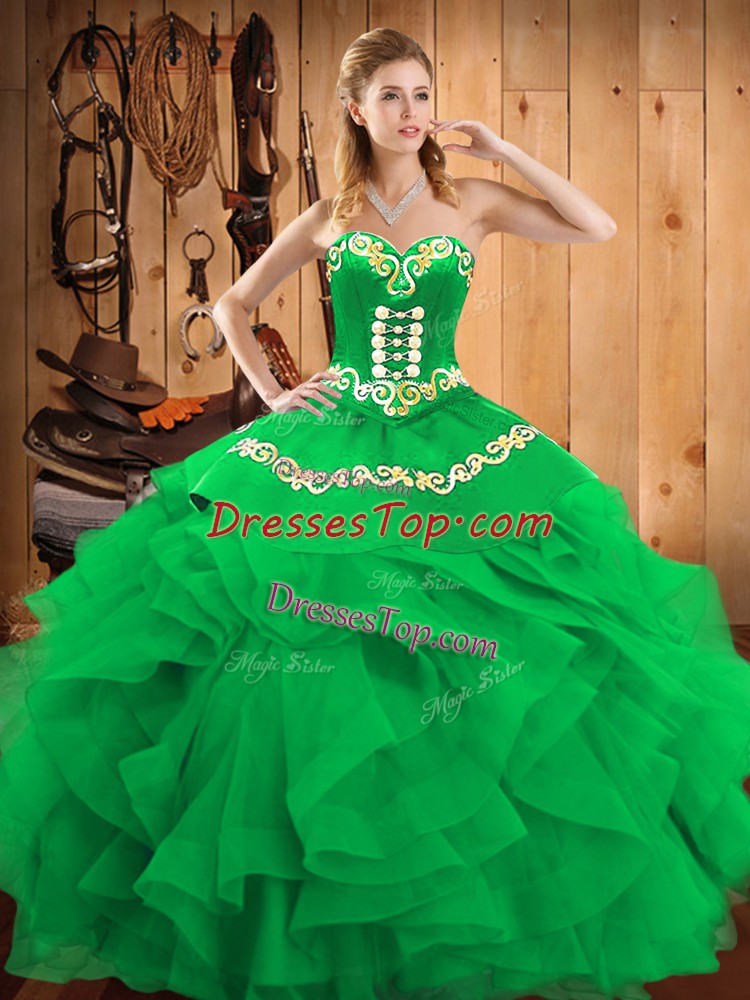 Super Sleeveless Satin and Organza Floor Length Lace Up Ball Gown Prom Dress in Green with Embroidery