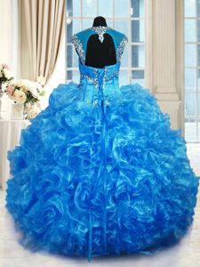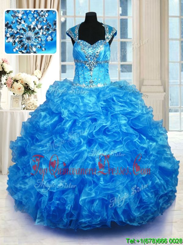 Super Straps Cap Sleeves Quince Ball Gowns Floor Length Beading and Ruffles Baby Blue Organza