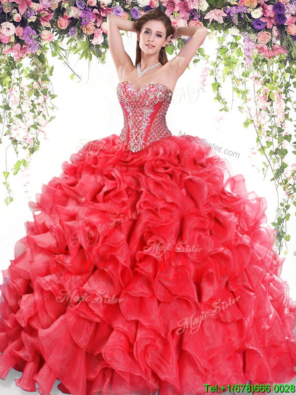 Super Sweetheart Sleeveless Sweep Train Lace Up 15 Quinceanera Dress Red Organza