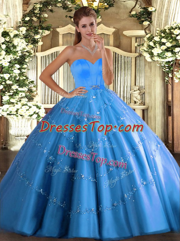 Superior Baby Blue Sleeveless Beading and Appliques Floor Length Quince Ball Gowns