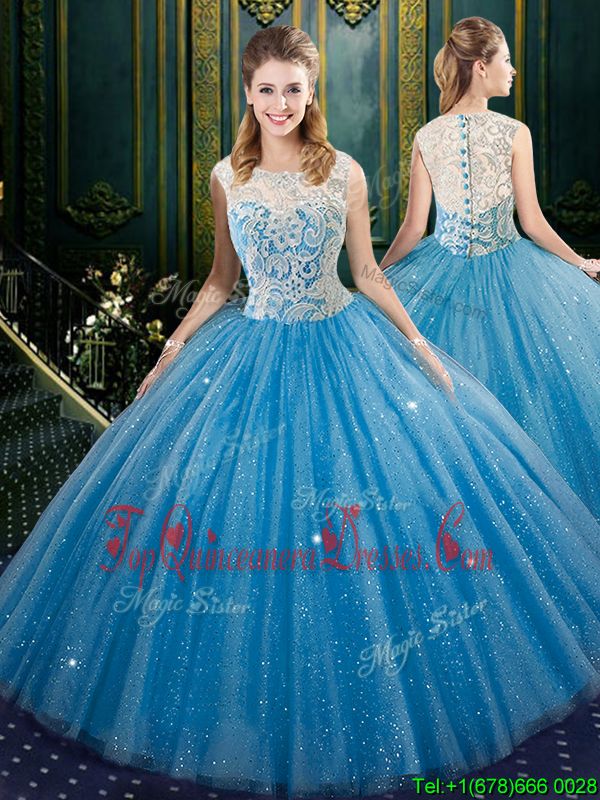 Superior Blue Lace Up High-neck Lace and Appliques 15 Quinceanera Dress Tulle Sleeveless