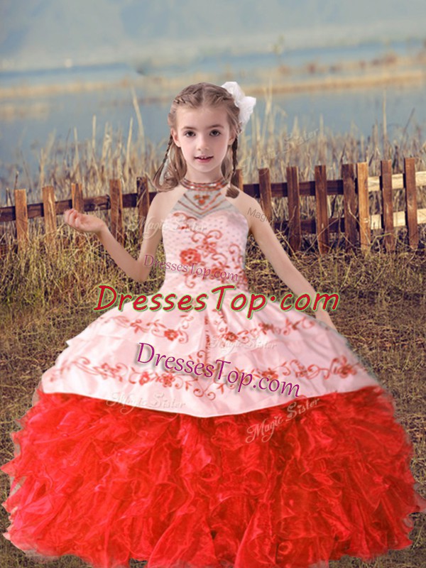 Superior Coral Red Ball Gowns Organza Halter Top Sleeveless Beading and Embroidery and Ruffles Floor Length Lace Up Pageant Dress