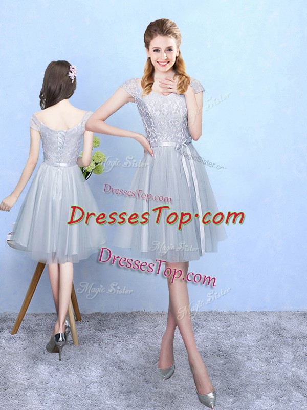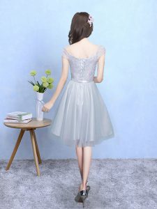 Superior Empire Quinceanera Dama Dress Silver V-neck Tulle Cap Sleeves Knee Length Lace Up