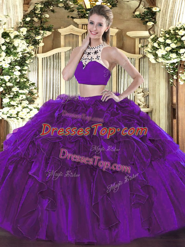 Superior Floor Length Eggplant Purple Ball Gown Prom Dress High-neck Sleeveless Backless