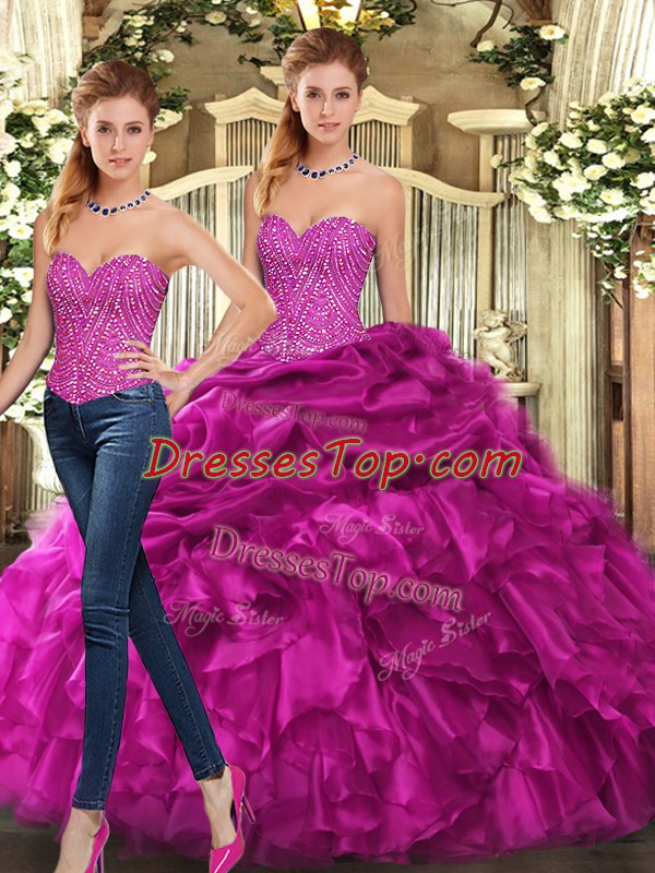 Superior Fuchsia Lace Up Sweetheart Beading and Ruffles 15 Quinceanera Dress Organza Sleeveless
