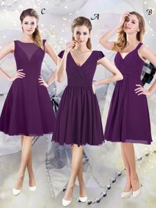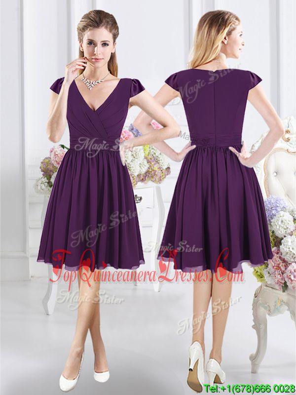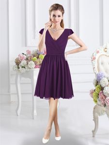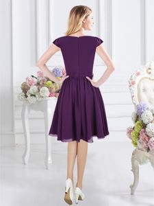 Superior Knee Length Purple Quinceanera Court of Honor Dress Chiffon Cap Sleeves Ruching
