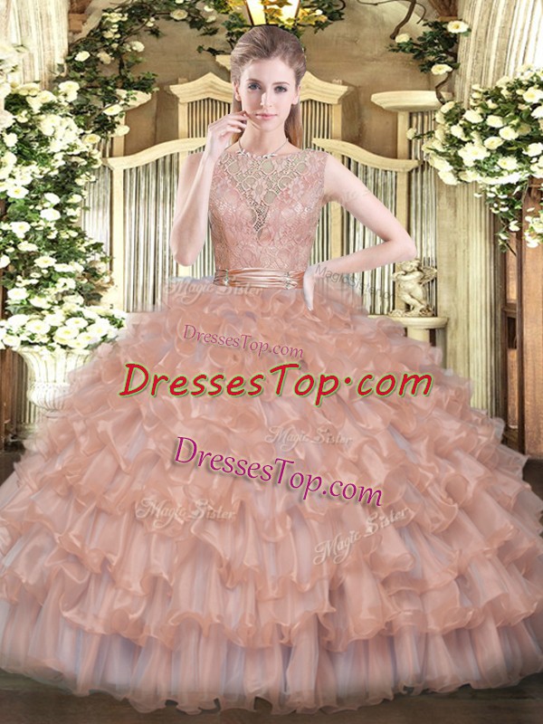 Superior Peach Ball Gowns Beading and Ruffled Layers Quinceanera Gown Backless Tulle Sleeveless Floor Length