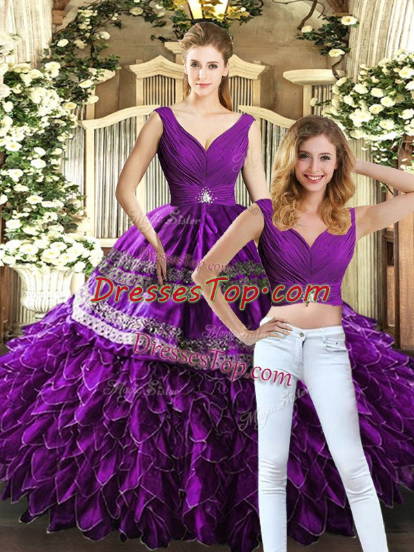 Superior Purple Sleeveless Beading and Embroidery and Ruffles Floor Length Quince Ball Gowns